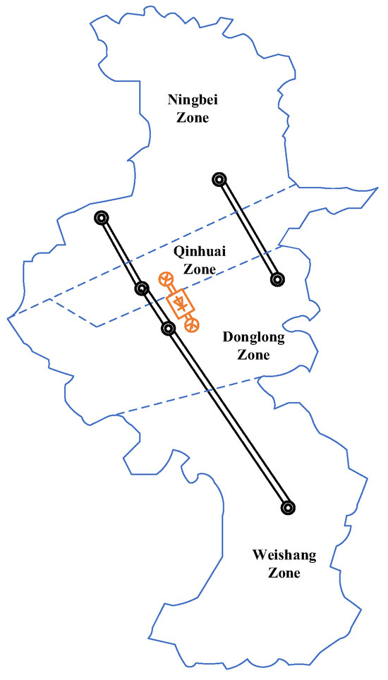 The distribution of Nanjing power supply zones is shown in Figure 10. The Nanjing power grid operates in four zones, including the Ningbei Zone, Qinhuai Zone, Donglong Zone, and Huishang Zone. Among them, the Qinhuai Zone and Donglong Zone are connected on the 500 kV grid through Line Qinhuai–Dongshan and the Longwangshan Substation. The Qinhuai Zone has a dense load and a high demand for power supply reliability.
