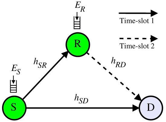 As illustrated in Figure 1, we consider a three-node cooperative communication system comprising a source (S), a relay (R), and a destination (D). Following the models in [22,24], the source communicates with the destination either directly or via the relay node. Both the source and the relay are equipped with omnidirectional antennas and operate as energy harvesting nodes, each supported by a rechargeable battery with an infinite storage capacity, as assumed in [20,24,28].
