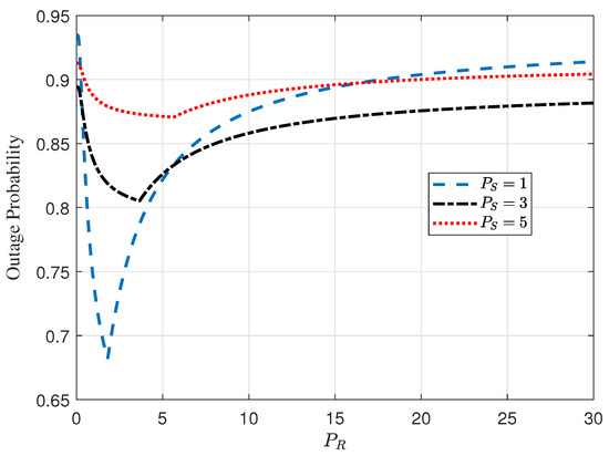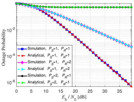 Note that the outage probabilities in Figure 4a and Figure 5a saturate at in the high-SNR regime. This behavior is expected. For the parameter settings in Figure 4a, the outage probability is dominated by the third condition in (15), while in Figure 5a, the outage probability is dominated by the fourth condition in the same equation. In both cases, as the SNR increases, the outage probabilities of all communication links tend toward zero. Consequently, the overall outage probability converges to the probability that the source does not have sufficient energy to transmit, which is 1 −. Given that in both scenarios, this saturation level simplifies to .