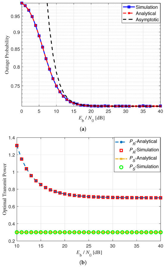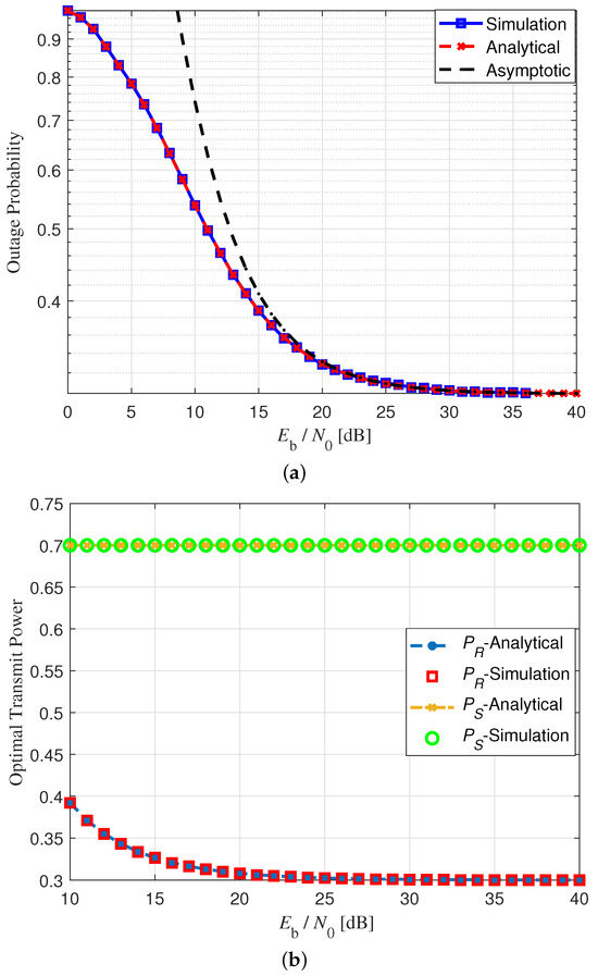 Figure 5a,b present the results for the same scenario described in the previous paragraph but with the energy harvesting rates set to and . As observed in the figures, the asymptotic outage probability closely matches both the analytical and simulated results at a high SNR, further validating the accuracy of the asymptotic expression. Moreover, it is evident that the analytically derived optimal transmit powers are in close agreement with those obtained via simulation, reinforcing the findings from the earlier scenario and supporting the validity of the power optimization approach.