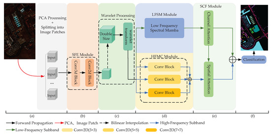 Structural diagram of the WTCMC network: (a) data preprocessing, (b) SFE, (c) wavelet processing, (d) LFSM and HFMC, (e) SCF, and (f) classification head. The workflow involves initially reducing the dimensionality of the raw input image using principal component analysis (PCA), followed by partitioning the resultant image into multiple patches. These image patches first pass through the shallow feature extraction module and are subsequently upsampled via bilinear interpolation. Next, a wavelet transform is applied to decompose the upsampled patches into low-frequency and high-frequency subbands. The low-frequency subbands are processed by the low-frequency spectral Mamba module, while the high-frequency subbands are handled by the high-frequency multi-scale convolution module. Finally, features extracted from both modules are integrated through the spectral–spatial complementary fusion module. The resulting fused features are then classified by the classification head, which consists of average pooling and a normalized linear layer.
