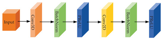 In Equations (8)–(10), denotes the 3D convolution operation, indicates batch normalization, and represents the Parametric Rectified Linear Unit () activation function.