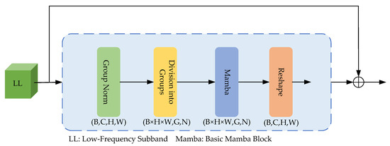 The low-frequency subband is then input into the LFSM module. Within LFSM, the spectral dimension C is partitioned into G non-overlapping groups, where each group contains contiguous spectral bands. For each group, the N spectral bands are treated as the embedding dimension, and the number of groups G defines the input sequence length for the Mamba model. The output from the Mamba model incorporates residual connections to minimize information loss. The operational details of the spectral grouping and sequential scanning mechanism are demonstrated in Figure 4. Mathematically, the LFSM module’s input–output relationship is expressed as