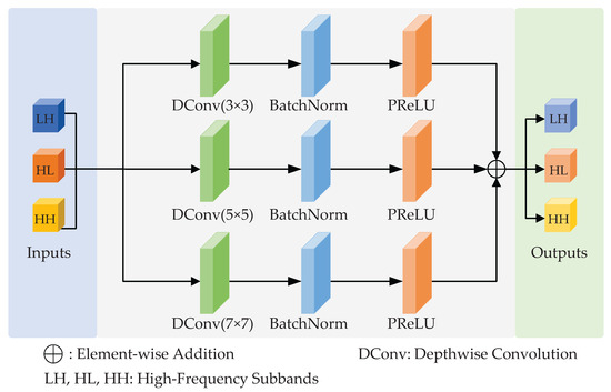 In the high-frequency multi-scale convolution (HFMC) module, we utilize a multi-scale feature extraction approach to effectively capture detailed spatial information from high-frequency wavelet subbands. The workflow is depicted in Figure 5. The three high-frequency subbands (, , ) are processed separately through three distinct branches, with different branches employing convolution kernels of different scales to capture multi-scale spatial features. Specifically, the first branch utilizes a convolutional kernel size of (3, 3), whereas the second and third branches adopt larger convolutional kernels of (5, 5) and (7, 7), respectively. Notably, after SFE processing, the feature map has spatial dimensions of . To capture spatial dependencies at multiple scales, we apply the three convolutional kernel sizes introduced above, which yield receptive fields ranging from fine local neighborhoods to broader context across the patch. This design preserves local detail while aggregating larger contextual cues. Each branch involves three sequential operations: depthwise convolution, batch normalization, and activation using the Parametric Rectified Linear Unit ().