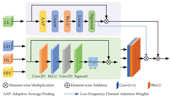 As illustrated in part (c) of Figure 1, features extracted by the shallow feature extraction (SFE) module first undergo bilinear interpolation, effectively doubling the feature sizes. This interpolation serves two critical purposes: (1) amplifying detailed spatial contours and fine image features, and (2) preserving feature sizes post-wavelet transform. Subsequently, the upscaled features undergo wavelet decomposition, as represented by the following equations: