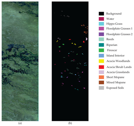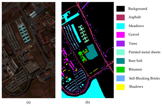 Pavia University dataset: (a) false color map and (b) ground truth.