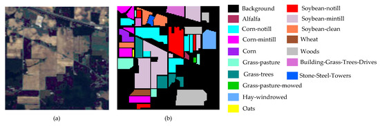 Indian Pines dataset: (a) false color map and (b) ground truth.