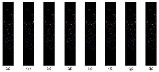 Indian Pines dataset: This dataset was collected by the AVIRIS sensor in the “Indian Remote Sensing Experiment” area in the agricultural region of northwestern Indiana. The image size is 145 × 145, and the raw data contains 224 spectral dimensions, with 200 spectral dimensions retained after removal of the water absorption band. In addition, the dataset has 16 different feature types and contains 10,249 labeled samples. The false color image, ground-truth map, and corresponding categories of the dataset are shown in Figure 9. We partition the data into training, validation, and test sets with ratios of 5%, 5%, and 95%, respectively. The sample counts for each split are reported in Table 4.