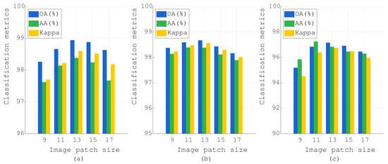 Effect of the image patch size on PU, Botswana, and IP datasets: (a) PU, (b) Botswana, and (c) IP.