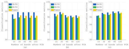 Selecting an appropriate number of spectral bands following PCA dimensionality reduction is critical for information retention and computational efficiency. To systematically investigate this effect, we varied the number of retained bands after PCA to 15, 30, 60, 90, and 120 for Botswana and IP datasets, with the maximum for the PU dataset set to 103 bands. The corresponding classification results are presented in Figure 14.
