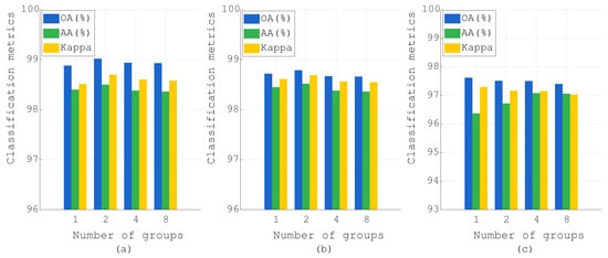 Effect of the number of groups in LFSM on PU, Botswana, and IP datasets: (a) PU, (b) Botswana, and (c) IP.