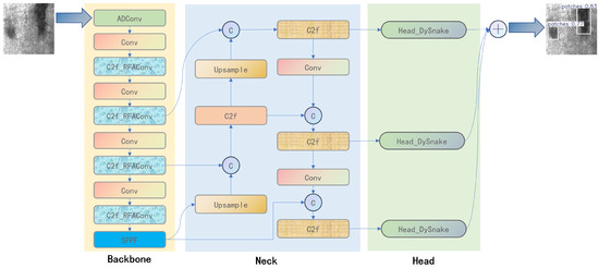 Overview of the YOLO-RSD architecture. The model is distinctly divided into three functional components, indicated by their respective background colors: the Backbone (yellow), the Neck (blue), and the Head (green). Upon input, images first pass through the ADConv module within the Backbone, which performs crucial denoising to mitigate the impact of complex environments on texture feature recognition. Following this, RFAConv modules are strategically placed to leverage large receptive fields, enabling the model to search for relevant texture structures within surrounding receptive fields based on the common clustered nature of defects, thereby enhancing the recognition of current regions. Finally, the Head_DySnake module in the Detection Head is designed to learn and extract intricate texture knowledge, facilitating the precise discovery and identification of defects from these learned textural patterns.