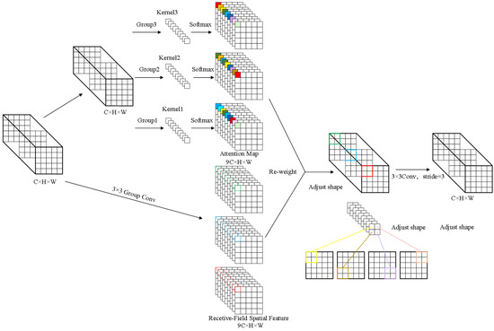 Detailed architecture of the RFAConv. RFAConv processes the input image through multiple branches: one branch extracts convolutional kernel content, while parallel branches generate attention maps. These are then combined to re-weight and produce new convolutional kernels. This multi-branch approach, by generating distinct kernels for different receptive field regions, effectively mitigates the issue of weak feature representation caused by shared parameters. The image in the bottom right provides a macroscopic representation of the RFAConv’s overall operation.