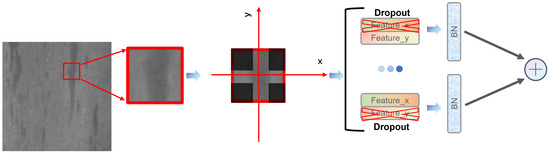 To enhance the YOLO-RSD’s understanding of defect texture structures, which often manifest as either singular linear patterns (e.g., crease-like textures) or complex stacked linear textures (e.g., snowflake-like structures), our detection head incorporates multi-directional DySnake sampling. These diverse texture structures are characterized by performing focused sampling along multiple directions. The results from these multi-directional convolutions are subsequently fused to form a comprehensive representation. Specifically, the unique texture-aware convolutional kernels are obtained through specialized sampling formulas focusing on the x-axis, as presented in Equation (6), and the y-axis, as detailed in Equation (7). This approach significantly augments the model’s capacity for intricate texture structure comprehension.