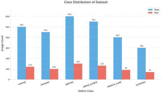 To validate the robustness of YOLO-RSD’s performance improvements, extensive experiments were conducted across multiple datasets, including NEU-DET [28,29,30] and GC10-DET [31]. The specific specifications for each dataset are detailed in Table 1. Additionally, a visual representation of the NEU-DET dataset’s distribution can be found in Figure 5.