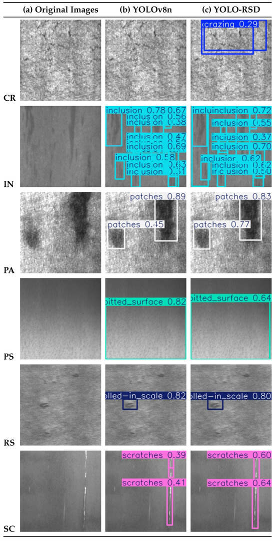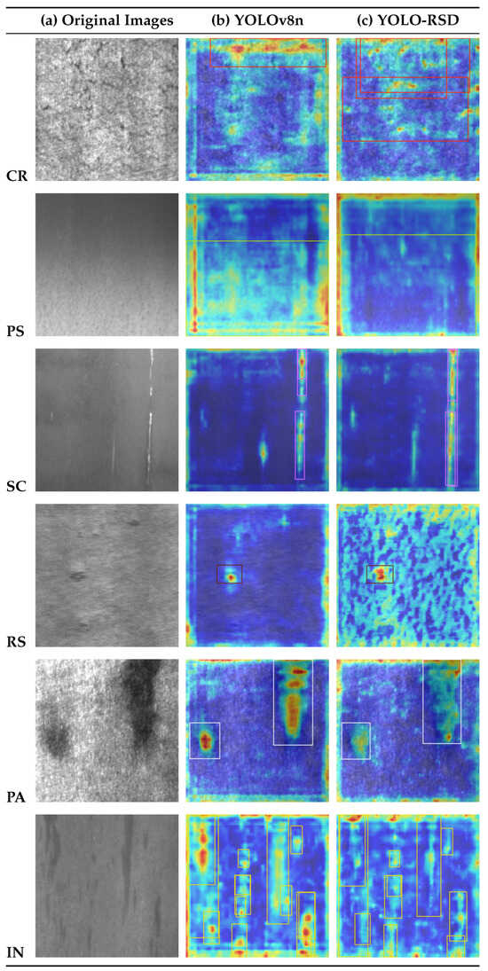In Figure 6, the visualization reveals that the YOLO-RSD generally exhibits improved overall recognition accuracy and prediction confidence. For instance, in the detection of PA and SC defects, the YOLO-RSD not only accurately localizes the defects but also demonstrates higher prediction confidence compared to the baseline, indicating a more resolute identification of these defect types. Notably, for CR defects, the YOLO-RSD successfully identifies and boxes defect content that the YOLOv8n previously missed, highlighting the model’s enhanced capability in capturing complex, irregular defects that are often hidden by background similarity and characterized by diverse texture fusions.