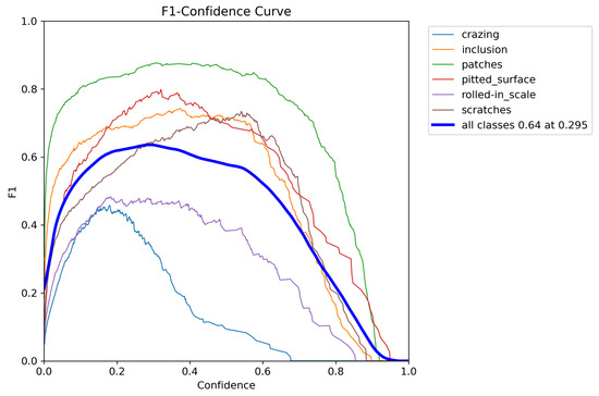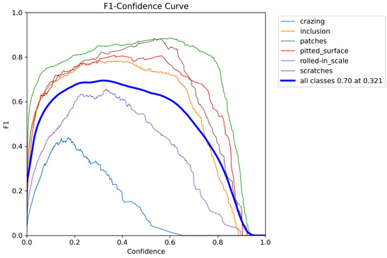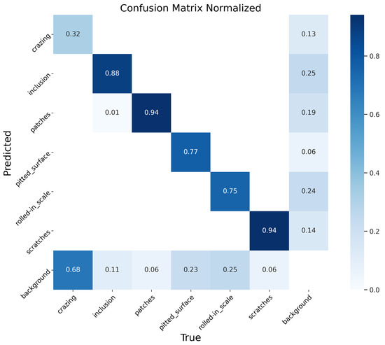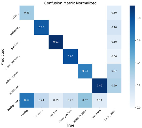 By comparing Figure 9 and Figure 10, it is evident that the YOLO-RSD significantly reduces the proportion of defects erroneously identified as background (i.e., values in the “background” row corresponding to defect columns) across most defect categories. For instance, the misclassification of rolled-in_scale as background decreased from 0.37 to 0.25. This improvement is primarily attributed to the powerful denoising capability of the ADConv module, which enables the model to more clearly distinguish between defect content and boundary features, thereby substantially reducing the incidence of false positives. Furthermore, for defects with prominent texture features, such as scratches, the increase in recognition accuracy is particularly notable. This benefit largely stems from our detection head, Head_DySnake, which is endowed with texture discrimination capabilities, effectively enhancing the model’s ability to discern such features.