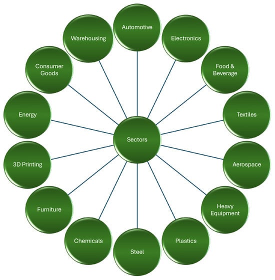 AI also plays a key role in textiles and apparel, improving production efficiency, design, and labor automation [56,57]. In aerospace and defense, AI enhances predictive maintenance, production optimization, and design processes. The heavy equipment industry uses AI for performance improvement, predictive maintenance, and autonomous machinery [50]. Similarly, AI optimizes processes in plastics, rubber, steel, and metal manufacturing, improving efficiency, quality, and production schedules [58].