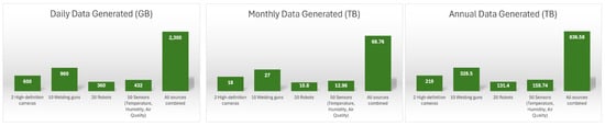 Considering the described data volume and to sum up, the data generated by just 2 cameras, 10 welding guns, 20 robots, and 50 environmental sensors, the factory produces about 2.3 TB of data daily. Over the course of a month, this amounts to approximately 68.76 TB, and annually, the factory generates around 836.58 TB of data as shown in Figure 3. However, this is a simplified estimate. In reality, factories are much larger, with hundreds or even thousands of cameras, welding guns, robots, and sensors. As a result, the actual data production could be at least 100 times higher than our hypothesis. This highlights the significant challenge that manufacturing plants face in storing, managing, and processing the enormous amounts of data they generate challenges that will only grow as technologies continue to evolve [80].