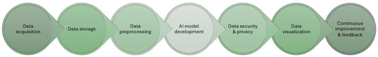 Finally, integrating data from ERP systems enhances the value of the data acquisition process. ERP systems consolidate business-critical information such as inventory levels, procurement activities, and supply chain management [155]. When combined with machine, operational, and maintenance data, ERP data offers a more complete picture of the production process, allowing AI systems to make informed, data-driven decisions that improve overall efficiency, reduce waste, and ensure the timely availability of resources.