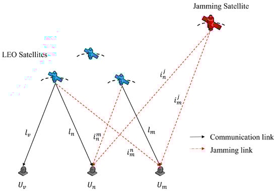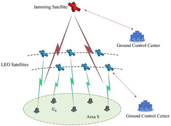 Low-Earth-orbit (LEO) satellites offer significant advantages, including low-latency communication, high data rates, and wide geographical coverage capabilities [,]. These attributes make their application a powerful supplement to terrestrial networks [,], and they have broad application prospects []. In recent years, the global deployment of LEO constellations (e.g., Starlink, OneWeb, and Kuiper) has been rapidly expanding in both speed and scale []. However, the inherent exposure of satellites and their reliance on open wireless channels make them susceptible to external malicious jamming and internal co-channel interference. Consequently, developing effective anti-jamming techniques is critical to ensure communication security. However, dynamic topologies [], limited resources [], and complex electromagnetic conditions [] in LEO networks pose significant challenges to achieving this goal.
