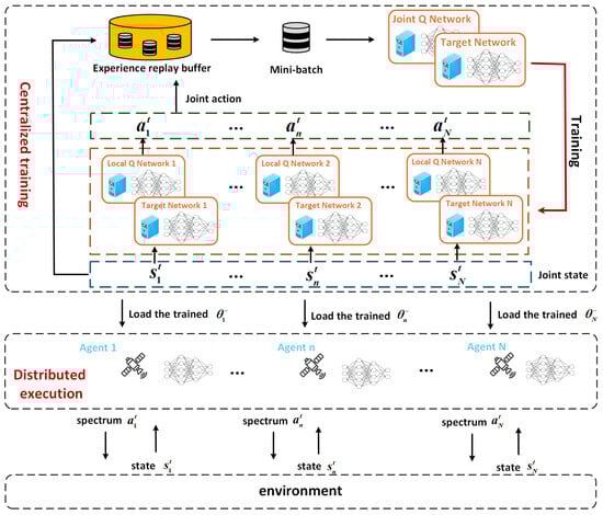 Centralized multi-agent DRL methods require global information and incur high computational overhead. Conversely, distributed multi-agent DRL approaches relying on local observations fail to converge to optimal solutions. To overcome these limitations, the VDN [] algorithm is adopted for multi-satellite anti-jamming spectrum access. This approach implements a centralized training and distributed execution framework. Global information is utilized during offline training, while local observations are required during online execution. The overall structure of the proposed algorithm is shown in Figure 3.