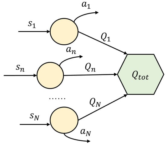 The VDN network architecture is shown in Figure 4. After approximating the joint Q-value , the VDN updates the network parameters by minimizing the global reward-based TD error, and the loss function is defined as