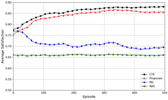 Figure 6 compares convergence among different methods, with the vertical axis denoting the satisfaction index. Evidently, the CTE method demonstrates superior convergence performance due to its global information awareness; its practical application is significantly constrained by satellite network communication and computational resources. The proposed method achieves approximately 97% of CTE’s convergence performance without excessive link overhead. It validates the effectiveness of the proposed method. The NIL method achieves a fully independent decision-making training mode, but the convergence performance is significantly reduced due to the lack of a cooperation mechanism. The RAS method has the worst performance due to its lack of learning ability.