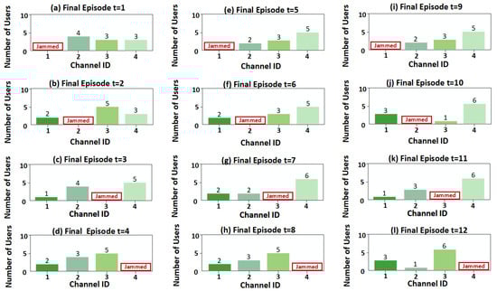 Figure 7 illustrates the users’ channel selection over 12 time slots after algorithm convergence under sweep jamming. It is obvious that the proposed method remains effective under sweep jamming, and users can thus avoid the channel selected by the jammer.