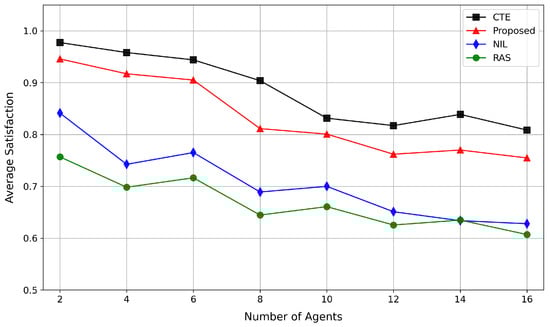 Figure 8 illustrates the impact of number of agents on user satisfaction. As number of agents increases, average satisfaction decreases for all the methods. The CTE method achieves the highest satisfaction. However, its computational costs rise significantly with user scaling. The NIL method reduces costs but causes frequent spectrum collisions from insufficient information exchange, so it has lower satisfaction. The proposed method maintains moderate satisfaction levels. Malicious jamming and computational costs are reduced through collaborative decisions. Thus, the proposed method is more suitable for spectrum management in LEO dynamic networks.