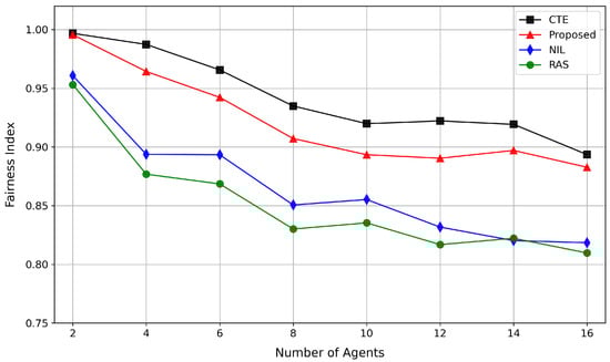 Figure 9 illustrates the impact of number of agents on network fairness. The fairness index exhibits a declining trend across all the methods with an increasing number of agents. Among them, the CTE method demonstrates the best fairness index, while the proposed method’s fairness index is slightly inferior to CTE. In contrast, due to a lack of coordination among agents, NIL exhibits a relatively poor fairness index. RAS achieves the worst fairness index owing to its lack of learning ability.