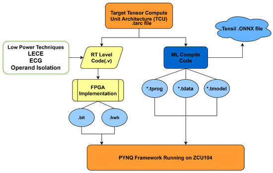 To implement a CNN accelerator suitable for Tiny YOLOv4, we leverage the Tensil toolchain, as shown in Figure 1, which includes an RTL generator, compiler, and deployment runtime. Tensil enables the rapid generation of a custom accelerator from trained model representations, providing support for quantized models and memory-efficient data flow. The key advantage of Tensil lies in its flexibility and accessibility at the RTL level, enabling hardware designers to apply further optimization techniques not offered by default. However, Tensil’s [14] built-in synthesis flow lacks advanced low-power capabilities, prompting us to apply additional RTL-level techniques targeting power reduction and throughput enhancement, as outlined in Section 3.