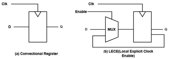 - Local Explicit Clock Enable (LECE)LECE is a clock-gating technique that uses a local ENABLE signal to selectively update the output of flip-flops or pipeline registers only when valid computation is required. As illustrated in Figure 2, LECE allows finer control over bit-level register updates, significantly reducing dynamic power in pipelines where many cycles involve idle data [17].