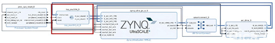 The Tensil open-source tool was cloned using Docker and Verilog modules such as top-zcu104.v, bram1, and bram2. These modules were integrated to form a custom IP block that serves as the core of the CNN accelerator. Figure 4 illustrates the connections between various IP blocks to ensure seamless communication with the FPGA board, including Zynq IP and API Smart Connects. The ‘top-zcu104’ module comprises several sub-modules, where low-power techniques are applied, including MACs, POOLs, CONV, InnerDualPort RAM, ALUs, and Counters [14]. Figure 5 presents the report of the utilization of the hardware components on the ZCU104 board after the synthesis and implementation completion [18].