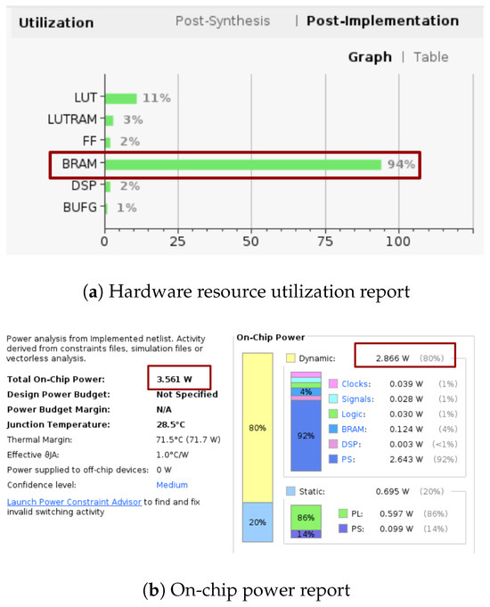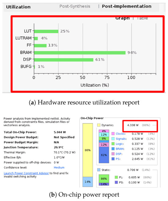 Hardware analysis of the proposed Tiny-YOLOv4 design on the ZCU104 FPGA: (a) resource utilization and (b) power consumption.