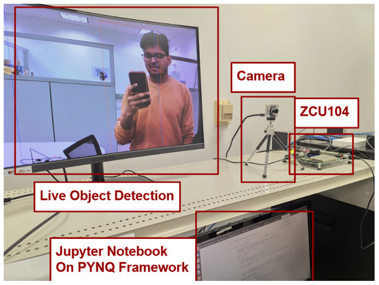 We selected the ZCU104 board as our foundational hardware platform due to its high-performance FPGA-SoC architecture, which combines a quad-core ARM Cortex-A53 Processing System (PS) with extensive Programmable Logic (PL). This setup integrates effectively with the PYNQ framework and supports Jupyter Notebook for rapid software development using Python, C/C++, and libraries such as OpenCV. As shown in Figure 6, the setup consists of a ZCU104 board and a camera connected to the board using USB [19]. We employed the Tiny-YOLOv4 architecture for real-time object detection, trained on a COCO dataset, and converted it into the ONNX format. The ONNX model was compiled using the Tensil tool-chain to generate three essential artifacts: .tmodel, .tdata, and .tprog, which the CNN driver utilizes to access model weights, program instructions, and configuration data. These artifacts remain unchanged from the original, ensuring that model accuracy is preserved. After successful execution of the bit-stream on the ZCU104 board, we achieved live object detection, as illustrated in Figure 7, which shows the Jupyter environment and real-time detection results using the Tiny-YOLOv4 model on the ZCU104.