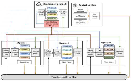 In Figure 2, the orange arrows represent all possible event-triggering conditions for each subsystem; the black arrows represent the flow of tasks actually executed in each node; the red arrows represent tasks that each edge node hopes to offload to the cloud for execution; the blue arrows represent the final decision of the cloud to allocate tasks to edge nodes or accept requests for execution in the cloud; and the green arrows represent the calculation results returned after the completion of the calculation task.
