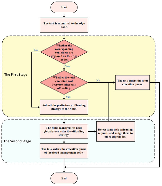 Since the actual deployment of edge nodes and cloud management nodes is far from becoming a reality, it is inevitable that there will be some delay in the information transmission process. Therefore, achieving complete information synchronization between edge nodes and management nodes will have a large time cost. Therefore, this paper divides the task-scheduling problem into two stages. The first stage is implemented by each edge node in a distributed manner, and the initial task-offloading decision is provided to the cloud under the premise of considering only its own resources. The second stage is performed centrally by the cloud management node. From the perspective of global resources, the final task-scheduling policy is generated in combination with the offload decisions of each edge node. The specific scheduling flow is shown in Figure 3.