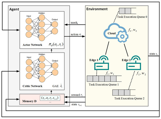 Proximal Policy Optimization (PPO) is a reinforcement learning method based on policy gradients, aimed at optimizing the policy to maximize long-term rewards. This algorithm was first proposed by Schulman et al. [34], with its key innovation lying in the introduction of a clipped objective function, built upon traditional policy gradient methods (e.g., TRPO), to stabilize the training process. This modification prevents excessively large policy updates, significantly enhancing both the stability of training and sample efficiency. PPO is based on the Actor–Critic architecture, where the Actor network generates action policies based on the current state and optimizes the policy through gradient ascent to maximize expected returns. The Critic network, on the other hand, evaluates the value of each state and provides feedback to help the Actor network refine its policy. Based on the advantages of the PPO algorithm, this paper applies it to global task scheduling decisions, addressing dynamic resource demands and ensuring efficient task allocation and resource utilization.