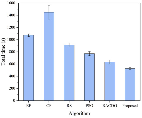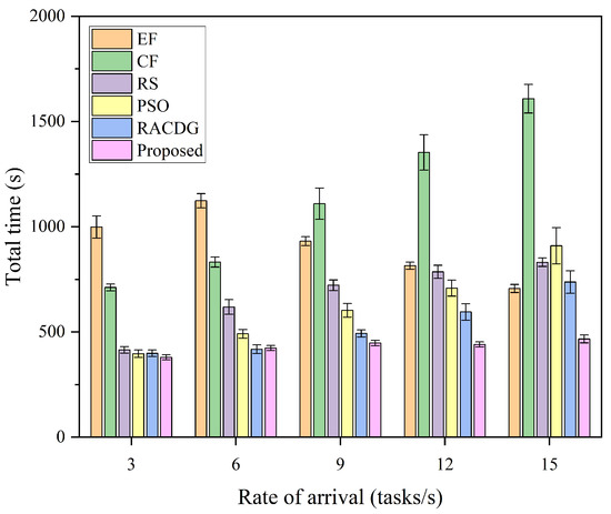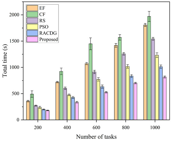 As shown in Figure 10, across the entire range of task arrival rates, the proposed two-stage collaborative scheduling algorithm exhibits significant performance advantages. Under low-load conditions (3 tasks/s), most algorithms achieve relatively low total task completion times. EF and CF show slightly higher total times due to uneven resource utilization and increased transmission overhead, respectively. Even at this stage, the proposed algorithm outperforms both EF and CF with a notably lower total task time. As the load increases to moderate levels (6–9 tasks/s), the total completion time of EF and CF rises sharply. EF suffers from resource bottlenecks at edge nodes, reducing task processing efficiency, while CF incurs substantial latency due to cloud-only task offloading. Although RS, PSO, and RACDG benefit from collaborative mechanisms and show moderate improvements, their task completion times remain higher than that of the proposed algorithm. Under high load scenarios (12–15 tasks/s), the EF algorithm misleadingly shows a reduction in the total task time due to the high number of dropped tasks. However, the actual task completion rate is significantly degraded, indicating extremely low system throughput. Meanwhile, CF experiences a steep increase in total time, exceeding that of all other algorithms, demonstrating that its cloud-centric strategy breaks down under high concurrency. Although RS, PSO, and RACDG alleviate resource contention to some extent, they are still unable to effectively balance the system load in highly concurrent environments. In contrast, the proposed algorithm consistently achieves the lowest total task completion time across all load levels. Moreover, the narrow error bars indicate low performance variance, underscoring the method’s stability and robustness. Compared to benchmark algorithms such as RS, PSO, and RACDG, the proposed method demonstrates superior adaptability and resilience under high-load conditions.
