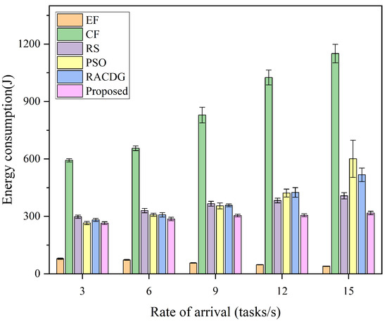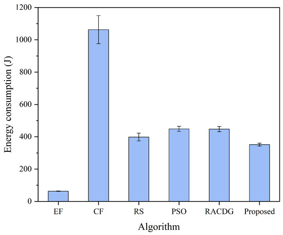 Figure 11 illustrates the total system energy consumption incurred by each scheduling algorithm under varying task arrival rates. As shown in the figure, the energy consumption trends differ significantly across algorithms as the load increases. The proposed two-stage collaborative scheduling algorithm consistently maintains low energy consumption across all load conditions, demonstrating excellent energy efficiency and scalability. In contrast, the CF algorithm exhibits the highest energy consumption at every task arrival rate, with total consumption rising sharply with increasing load. At 15 tasks/s, its energy consumption exceeds 1100 J. This is primarily due to CF’s cloud-centric strategy, which results in substantial communication overhead and energy costs from frequent task offloading and data transmission. Furthermore, CF shows large error bars, indicating high variability and poor performance stability. The EF algorithm processes tasks exclusively on low-power edge nodes, thereby avoiding the energy overhead associated with cloud communication. However, due to resource constraints, EF completes only around 40% of all tasks. Consequently, its low-energy-consumption figures are misleading, as they do not reflect actual scheduling effectiveness or system throughput. Benchmark algorithms such as RS, PSO, and RACDG demonstrate moderate energy performance. Among them, PSO shows a significant increase in energy consumption and large variance under high-load conditions (15 tasks/s), highlighting its limited robustness. Overall, the proposed algorithm achieves the lowest or second-lowest energy consumption at all load levels. Notably, under the high-load scenario of 15 tasks/s, it outperforms RS, PSO, and RACDG by a substantial margin, while maintaining minimal variance, which further confirms its robustness and stability in dynamic environments.