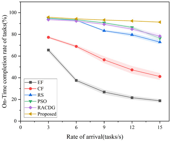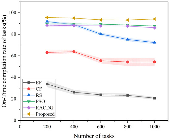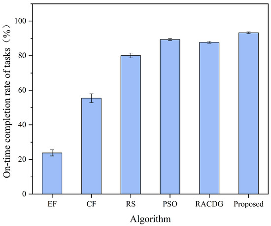 Under experimental conditions with a task arrival rate of 10 tasks per second and a total of 600 tasks, a comprehensive performance comparison of various scheduling algorithms was conducted, as illustrated in Figure 7, Figure 8 and Figure 9. To verify the statistical significance of the performance differences, a one-way analysis of variance (ANOVA) was performed. The results indicate the proposed algorithm outperforms the other algorithms in terms of task completion time, energy consumption, and task on-time completion rate. The statistical significance of these differences (p < 0.001) underscores the effectiveness and reliability of the proposed approach.