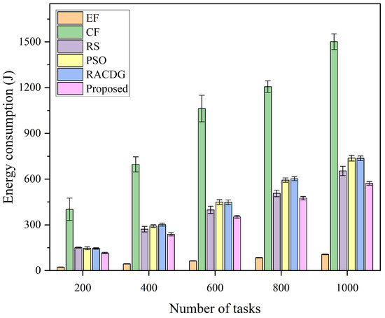 Figure 14 illustrates the total system energy consumption of each scheduling algorithm under varying task volume conditions. As the number of tasks increases, all algorithms exhibit an upward trend in energy consumption, reflecting the growing processing load associated with larger task scales. The EF algorithm consistently shows the lowest energy consumption. However, it is important to note that EF only completes a subset of the total tasks due to resource limitations, which results in misleadingly low energy consumption figures. Consequently, despite its seemingly favorable energy metrics, EF exhibits poor overall scheduling performance and lacks practical applicability in real-world scenarios. In contrast, the CF algorithm consistently incurs the highest energy consumption across all task volumes. Its energy usage increases rapidly with task scale, especially when the number of tasks reaches 1000, at which point energy consumption exceeds 1500 J. This is primarily attributed to the significant communication overhead introduced by full cloud offloading. The RS, PSO, and RACDG algorithms maintain relatively low energy consumption when the task volume is small. However, once the number of tasks surpasses 600, their energy usage escalates sharply, indicating reduced scheduling efficiency and imbalanced resource utilization under large-scale workloads. Notably, the proposed two-stage collaborative scheduling algorithm consistently achieves low energy consumption across all experimental conditions. It exhibits a stable and gradual growth trend, and in large-scale scenarios (800 and 1000 tasks), its total energy consumption is significantly lower than that of CF, RS, and PSO. These results confirm the algorithm’s superior energy efficiency and scalability for large-scale task scheduling.