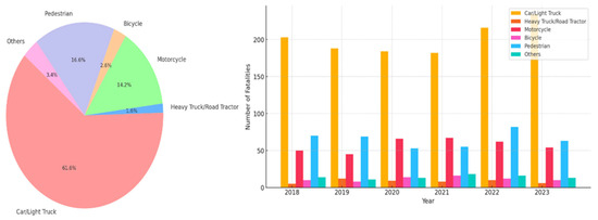 Distribution of fatalities by type of road user in 2023 and comparison of fatalities by type of road user from 2018 to 2023.