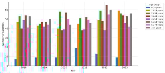 The number of road fatalities also varied across different age groups in 2023. Deaths decreased among individuals aged 0 to 14, 25–34, 55–64, and 65–74, while there was an increase in fatalities for people aged 15–24, 35–44, and 45–54. The 15–24 age group saw the most significant rise, with 59 deaths, marking a 20.4% increase compared to 2022 and a 31.7% increase compared to the 2018–2022 average. This demographic accounted for 15.7% of total road deaths. On the other hand, fatalities among individuals aged 75 and older dropped by 6.7% from 2022, though they remained 10.7% higher than the five-year average, as shown in Figure 2. This shows that road traffic accidents are a serious problem in Quebec, Canada.