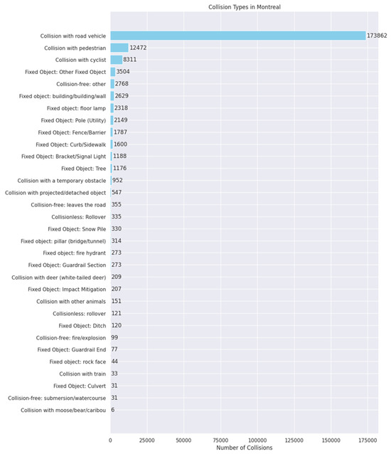 - City of Montreal. Road Collisions, [Dataset], in Données Québec, 2018, Updated 27 February 2025. Available online: https://www.donneesquebec.ca/recherche/dataset/vmtl-collisions-routieres (accessed on 1 March 2025).