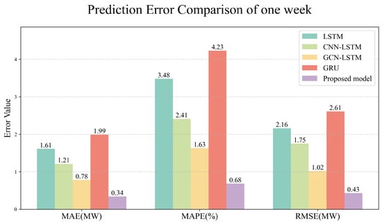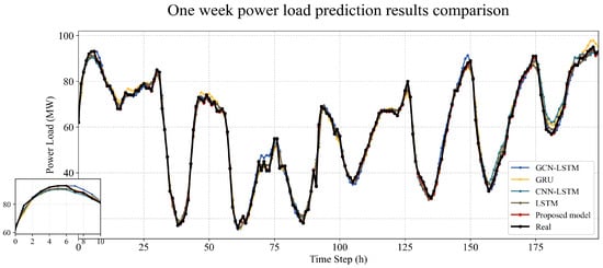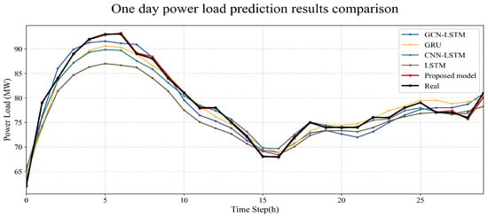 Figure 8, it can be seen that the GCN-BiLSTM-AB model outperforms traditional power-load forecasting models in terms of prediction accuracy, whether forecasting daily load or the load for the upcoming week.