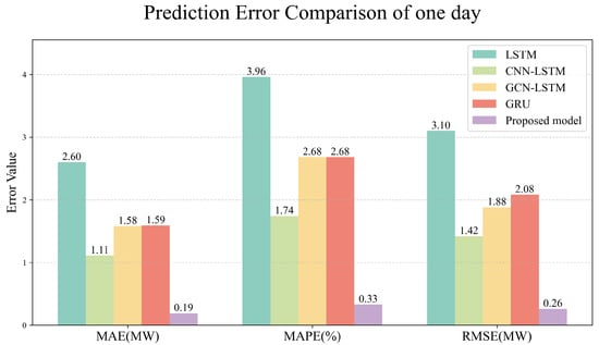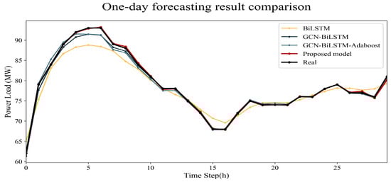 Figure 11 shows the one-day forecasting result comparison between the proposed model and the BiLSTM, GCN-BiLSTM, and GCN-BiLSTM-Adaboost models.