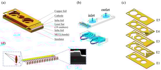 Schematic diagrams of laser packaging. (a) Schematic diagram of the laser structure; (b) schematic diagram of microchannel heat dissipation; (c) internal structure diagram of the microchannel heat sink; (d) laser bar and its partial enlarged view.