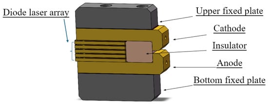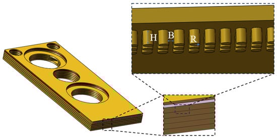 A single microchannel water-cooled packaged semiconductor laser bar is shown in Figure 1, which consists of a micro-channel cooling (MCC) heat sink, solder layer, semiconductor laser bar, insulating film, electrode, and copper foil [2]. The P-side of the bar is soldered onto the heat sink. The microchannel heat sink is fabricated by welding five layers of oxygen-free high-conductivity copper, with dimensions of 27 mm × 10.8 mm × 1.5 mm. The semiconductor laser bar emits at a wavelength of 808 nm, with a cavity length of 1 mm, a fill factor of 30%, and a total of 19 emission points. The operating power of a single bar is 60 W, and due to an electro-optical conversion efficiency of 60%, the thermal load during operation is 40 W. To achieve higher laser output power, multiple MCC-packaged semiconductor laser bars are typically stacked along the fast-axis direction to form a semiconductor laser array, with rubber O-rings used for sealing. Five MCC laser bars are vertically stacked, as shown in Figure 2. The semiconductor laser array employs a parallel cooling circuit with an inlet water velocity of 6 m/s and a temperature of 25 °C for heat dissipation. During operation, heat dissipation in semiconductor laser arrays is primarily achieved through forced cooling via microchannel heatsinks, while radiative heat loss and air convection are considered negligible [15]. Table 1 summarizes the material properties of each layer in the semiconductor laser array, assuming temperature-independent properties.